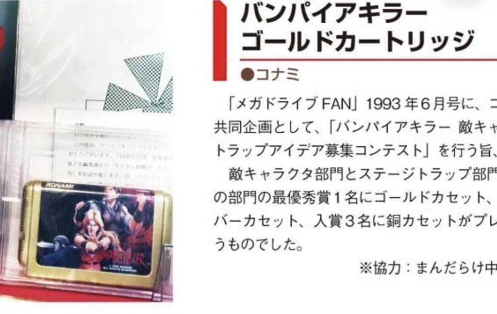В 90-х годах японский журнал Mega Drive FAN провёл конкурс, победители которого получили копию Vampire Killer на картридже с золотым корпусом. Пользователь социальных сетей с ником jironosuke99 отметил, что тот самый конкурс уже почти превратился в городскую легенду. Поэтому стоит напомнить общественности, что золотой картридж действительно существует.