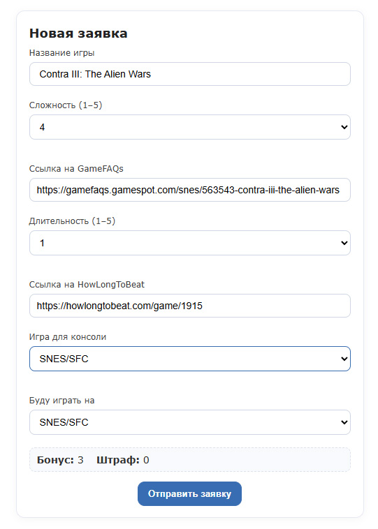 ж) В форме заявки обязательно должны быть заполнены три поля: название игры, для какой она консоли (или ПК), на чём будете её проходить. От последних двух параметров будет зависеть бонусный балл.
