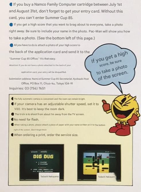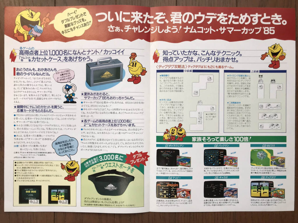 Например, в 1985 году компания Namco организовала летний конкурс для японских поклонников своих игр. Его правила были предельно простыми. Принять участие могли все, кто купил картридж (или картриджи) с играми Namco для 8-битной консоли Nintendo Famicom с 1 июля по 31 августа того года. На страницах журнала с условиями конкурса организаторы упомянули шесть игр: Galaxian, Pac-Man, Xevious, Galaga, Mappy и Dig-Dug.