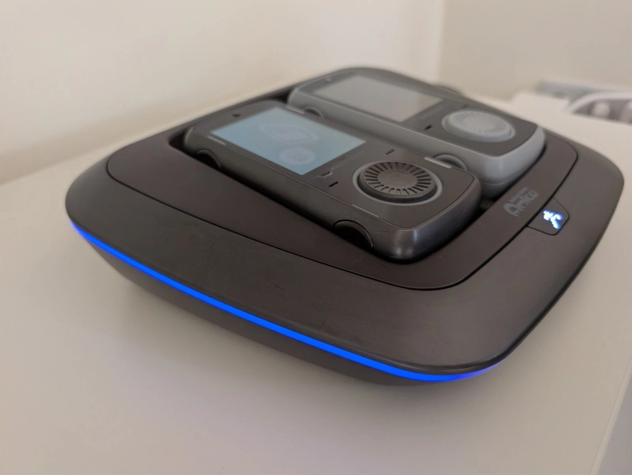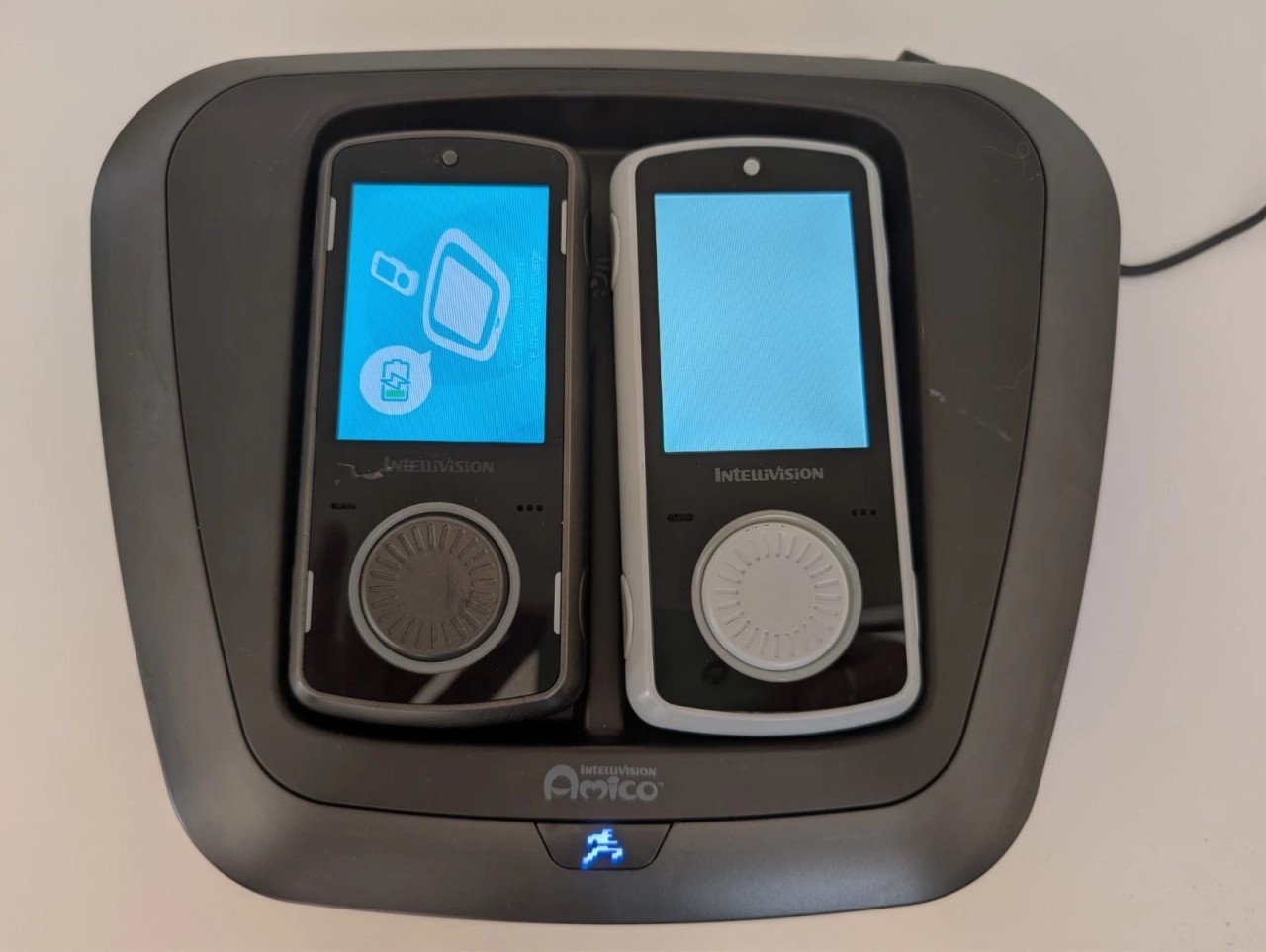Один контроллер полностью работоспособен. При включении устройства на экране появляются различные меню и уведомления, а также голосовые подсказки. Светодиодный экран второго контроллера неисправен. Талантливые разработчики и любители, вероятно, смогут заменить экран и подключить контроллеры к Android-консоли по Wi-Fi».