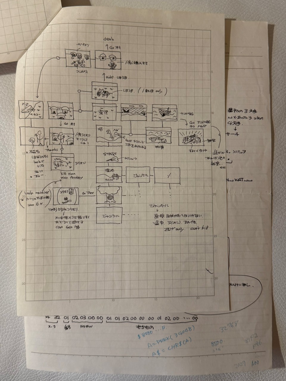 Сакагути опубликовал фотографию документа в своей социальной сети Х, но не стал уточнять, что это за игра. Однако фанаты сразу смекнули, что краткое описание сюжета на японском и наброски карт от руки относятся к текстовой приключенческой игре The Death Trap, которую Square выпустила в 1984 году для платформ PC-88, PC-98 и FM-7.