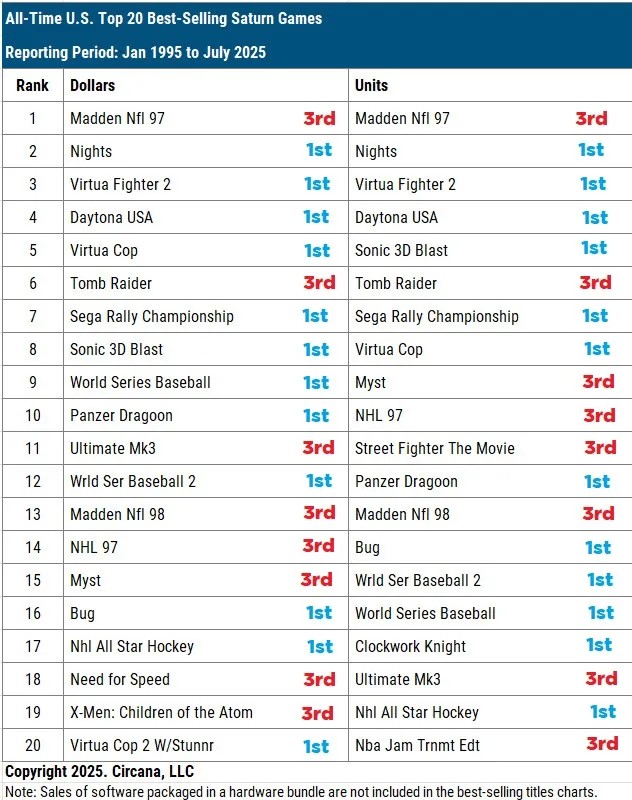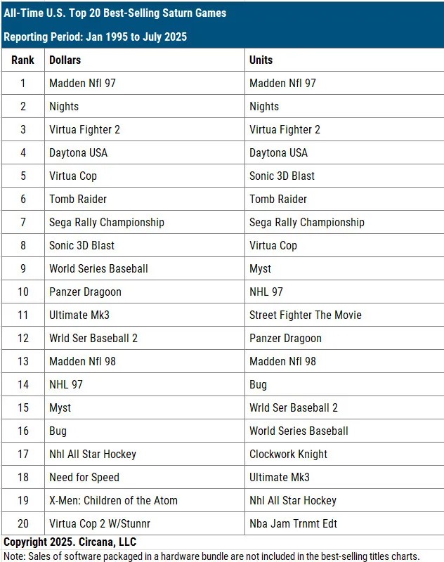 Ведущее аналитическое агентство рынка видеоигр Circana опубликовало информацию, которая даёт представление о продажах игр для Sega Saturn на территории США.