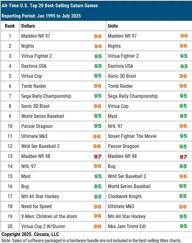 Четыре лучшие игры в обоих списках одинаковы: Madden NFL 97, Nights into Dreams, Virtua Fighter 2 и, наконец, Daytona USA. После этого списки начинают различаться. В соответствии с политикой Circana, цифры продаж и суммы в долларах не приводятся. Тем не менее, из позиций в рейтингах и различий между двумя столбцами можно сделать множество выводов.
